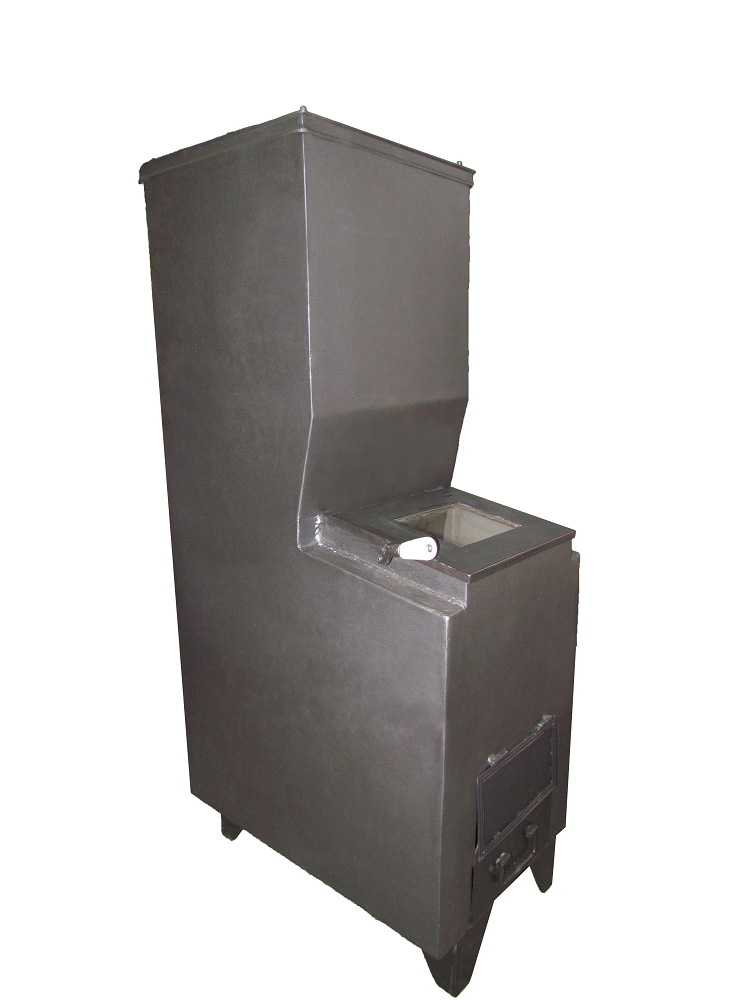 - Lemnul de foc așezat vertical în gura de alimentare, arde numai la capătul de jos, alimentând soba gravitaţional pe măsură ce cade în foc.